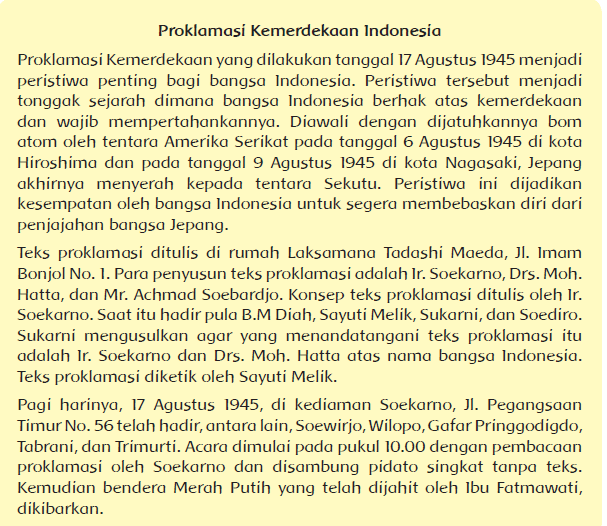 Teks tersebut adalah teks proklamasi kemerdekaan negara indonesia. Kunci jawaban buku tematik kelas 6 tema 2 revisi 2017. Teks proklamasi yang dibacakan memiliki sejarah bagi bangsa indonesia. Sejak teks proklamasi kemerdekaan dibacakan, rakyat indonesia memiliki negara merdeka, berdaulat, dan bermartabat. Tonggak sejarah negara indonesia pembacaan teks proklamasi merupakan awal dari masa.